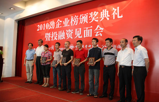 8月14日,由錢江晚報、浙商研究會、中科商學研究院、浙商創投聯合主辦的“2010勁企業榜頒獎禮暨投融資見面會”在金溪山莊舉行,20多家勁企業赴現場領獎,浙商研究會會長胡祖光、浙商創投管理公司董事長陳越孟、錢江晚報副總編蕭敏健、中科商學研究院執行院長潘強龍為獲獎企業頒獎。