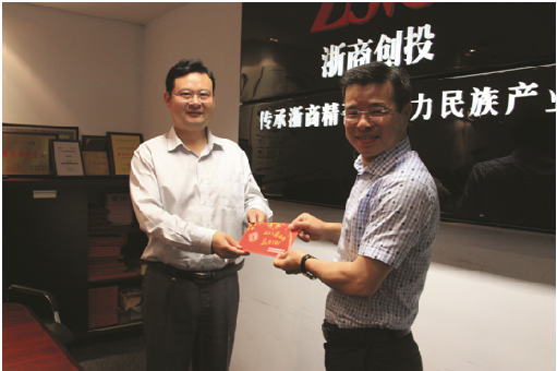 金承濤(上圖左)代表西湖區(qū)為浙商創(chuàng)投送上2012年度財(cái)政貢獻(xiàn)獎勵