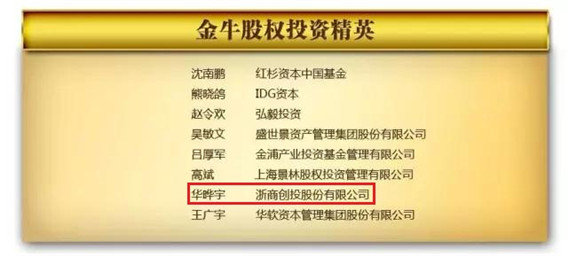 8月26日,“股權大時代 投資新生態”——第一屆中國股權投資金牛獎頒獎典禮暨高峰論壇在北京隆重舉行。浙商創投行政總裁華曄宇受邀參加論壇。會上揭曉了第一屆中國股權投資金牛獎,浙商創投榮獲“金牛創業投資機構獎”,華曄宇榮獲“金牛股權投資精英獎”。紅杉中國基金、深創投、IDG資本;鼎暉投資、弘毅投資;海通開元、金石投資等股權投資機構分別榮獲“金牛創業投資機構”、“金牛私募股權投資機構”和“金牛券商直投機構”殊榮。