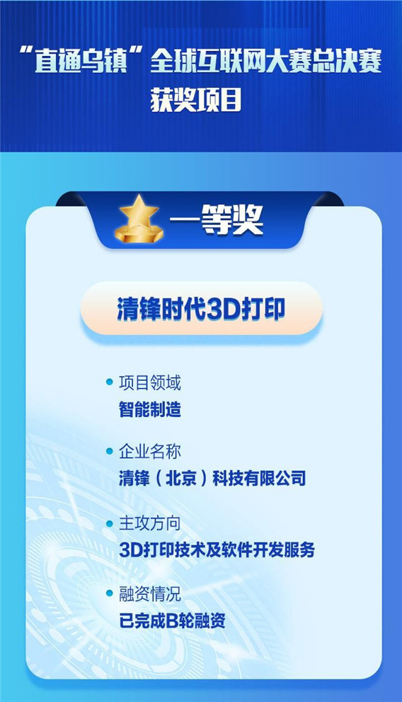 大賽自4月份啟動以來,共舉辦了5站國內選拔賽(香港、北京、成都、上海、深圳)、3站海外選拔賽(以色列、德國、美國)和線上賽,共吸引了全球千余個項目參與,來自13個國家和地區的500余個項目直接參賽,最終通過各站選拔和在線比拼,最終精選了34個項目入圍半決賽,前十強入圍“直通烏鎮”全球互聯網大賽總決賽。經激烈角逐,清鋒(北京)科技有限公司帶來的3D打印機奪得大賽冠軍。