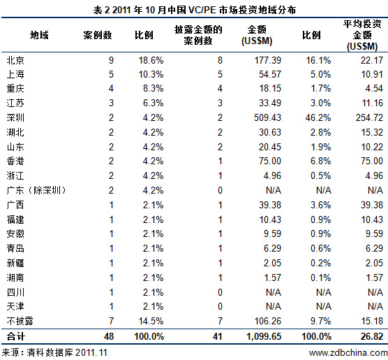 從披露的投資金額上來看,深圳摘得頭籌,披露金額的2起投資案例,涉資約5.09億美元,占比46.2%;其中1起來自中信證券PIPE融資5億美元的貢獻;北京位列第二位,有8起披露金額的投資案例,涉資約1.77億美元,占比16.1%。香港位列第三位,披露金額的1起投資案例,涉資7500萬美元;10月17日,凱雷投資集團宣布,其旗下的10億美元亞洲成長基金IV已協同阿里巴巴創始人馬云支持的私募股權投資基金——云峰基金,聯合收購數字影院解決方案提供商——環球數碼創意科技有限公司(GDC Technology Ltd)80%股權,凱雷方面此次將向環球數碼投資約7500萬美元。