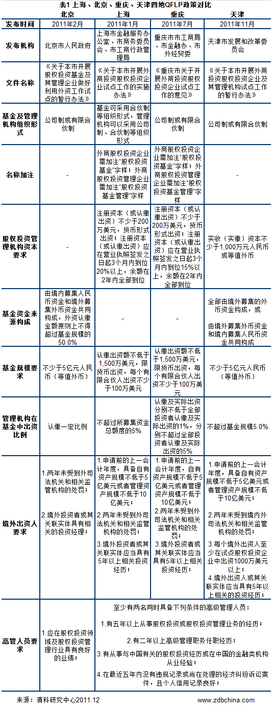 從2011年1月上海市出臺《關(guān)于本市開展外商投資股權(quán)投資企業(yè)試點工作的實施辦法》到11月天津下發(fā)《關(guān)于本市開展外商投資股權(quán)投資企業(yè)及其管理機(jī)構(gòu)試點工作的暫行辦法》,我國四個直轄市均已頒布出臺當(dāng)?shù)氐腝FLP政策。對比上海、北京、重慶及天津四地QFLP政策,清科研究中心認(rèn)為,天津版QFLP在對股權(quán)投資管理企業(yè)資本要求方面更為嚴(yán)格,要求實收(實繳)資本不少于1,000萬元人民幣或等值外幣;在股權(quán)投資基金資金來源方面,天津QFLP允許基金全部由境外募集的外幣資金構(gòu)成,或由境外募集外幣資金和境內(nèi)募集人民幣資金共同構(gòu)成,上海及重慶并未對基金資金來源提出具體要求,而北京方面則要求由境內(nèi)募集人民幣資金和境外募集外幣資金共同構(gòu)成,外資認(rèn)繳金額原則上不得超過基金規(guī)模的50.0%;上海、重慶及天津地區(qū)對于股權(quán)投資管理機(jī)構(gòu)高管人員的資質(zhì)要求完全一致,相比之下北京QFLP在這方面十分寬松,僅提出高管人員“應(yīng)在股權(quán)投資領(lǐng)域及股權(quán)投資管理行業(yè)具有良好的業(yè)績”。天津作為最后一個出臺QFLP政策的直轄市,上海、北京及重慶三地的QFLP為其提供了借鑒,同時,天津QFLP完善了當(dāng)中不明確的要求,落實起來更為清晰。
