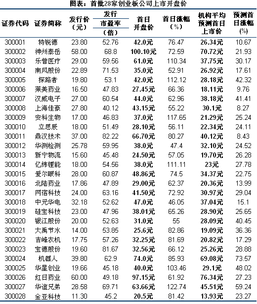 一開盤,28家創(chuàng)業(yè)板公司股票均告上揚,并大幅超過此前機構(gòu)預測。其中,漲幅最大為華誼兄弟,開盤報63.66元,較發(fā)行價上漲122.74%,漲幅最小為中元華電,開盤報47.0元,較發(fā)行價上漲46.05%,神州泰岳開盤突破百元大關(guān),成為股價最貴的個股。
