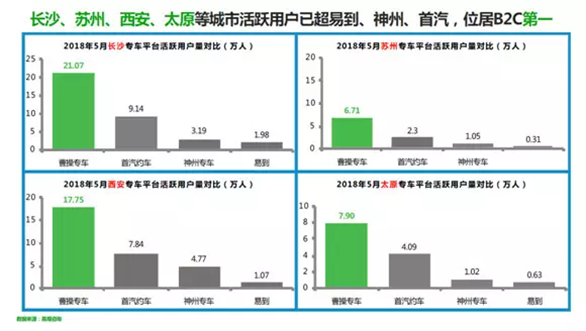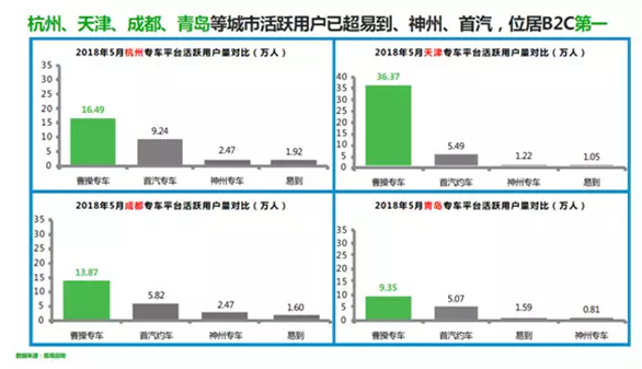 來自易觀咨詢的數據顯示,自2015年5月成立以來短短的三年時間里,曹操專車在多個城市的活躍用戶量已經超過易到、神州專車、首汽約車等平臺位居B2C網約車第一,僅僅次于滴滴。這些城市包括:杭州、天津、成都、青島、長沙、蘇州、西安、太原、寧波、廣州、武漢、深圳等。其中,杭州上線6個月后就成為B2C網約車第一名。