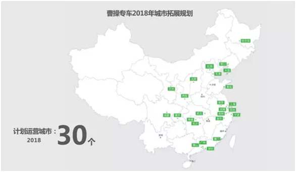 按照劉金良公布的未來城市拓展規劃,曹操專車的運營城市將在未來兩年以每年增加十個城市的速度遞升:今年達到30個,明年達到40個,2020年達到50個。屆時,累計投放運營車輛將超過5萬輛。在曹操專車官網的首頁“所在城市”下拉菜單中,已經顯示有32個城市:北京、天津、太原、大連、營口、哈爾濱、上海、南京、無錫、蘇州、杭州、寧波、金華、臺州、廈門、漳州、濟南、青島、濱州、鄭州、武漢、長沙、常德、廣州、深圳、佛山、重慶、成都、昆明、西安、咸陽和蘭州。
